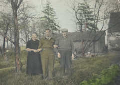 met hun kinderen voor hun woning die vanwege de Tweede Wereldoorlog in