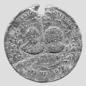 | Medaille / Herinneringspenning (Lood. Doorsnede 29 mm). 25 JARIG KONINGSFEEST Koning en koningin der Nederlanden 1849 MEI 1874. Koning Willem III en Koningin Sophie vieren hun zilveren regeringsjubileum op 12 mei 1874. Vindplaats: Op het bouwland van Job Joosten. (1977). Oude Peelstraat / Hovenierstraat. Waarschijnlijk meegekomen met straatvuil vanuit 's-Hertogenbosch. Dit werd gebruikt als bemesting van de ontgonnen veengronden in Helenaveen. Of daar eenvoudigweg door een Helenavener verloren... |